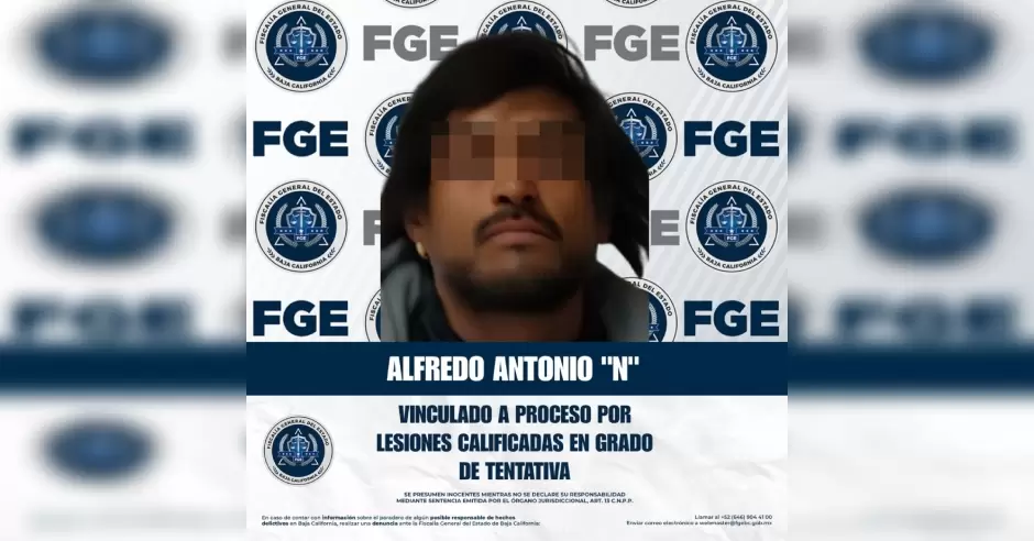 TECATE.- La Fiscalía Regional de Tecate informa que, gracias a las labores realizadas por la Unidad de Investigación de Delitos con Detenido, se logró obtener la medida cautelar de prisión preventiva, así como la vinculación a proceso en contra de Alfredo Antonio "N", por su probable responsabilidad en el delito de lesiones calificadas en grado de tentativa.