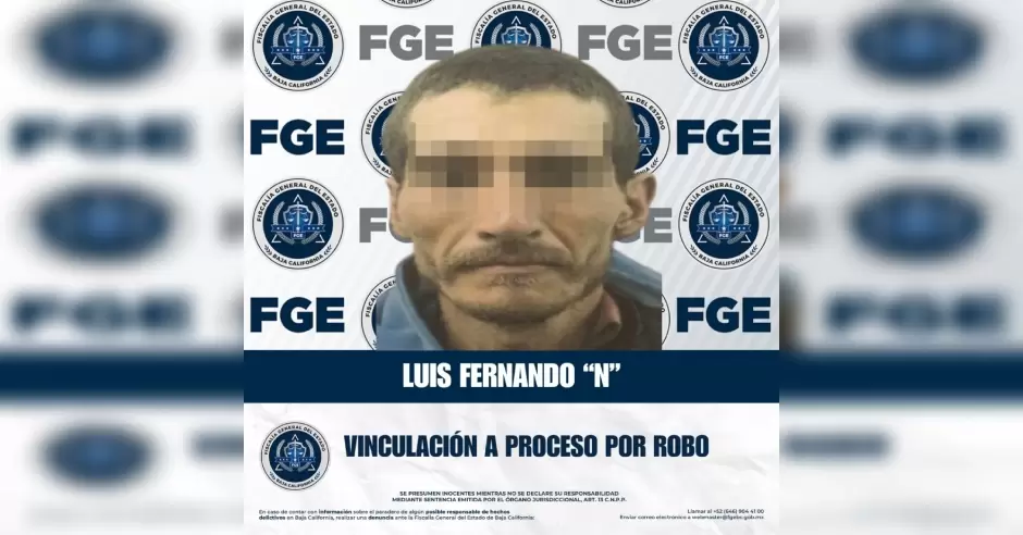 TIJUANA.- La Fiscalía Regional de Tijuana, a través de la Unidad de Investigación con Detenido, obtuvo la vinculación a proceso de Luis Fernando "N", por su presunta responsabilidad en el delito de robo.
