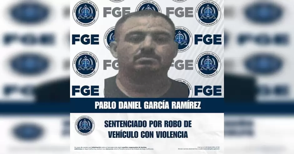 TIJUANA.- La Fiscalía Regional de Tijuana, a través de los trabajos realizados por la Unidad de Investigación de Robo de Vehículos, Zona Tijuana, obtuvo sentencia condenatoria en contra de Pablo Daniel García Ramírez, por su responsabilidad en los delitos de robo equiparado de vehículo de motor en su modalidad de usar y robo de vehículo con violencia, derivados de hechos ocurridos en esta ciudad.