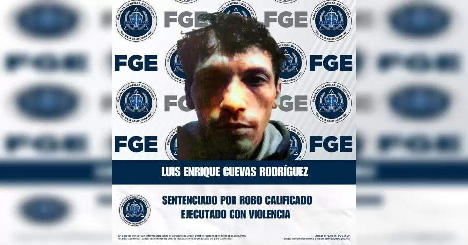 TIJUANA.- La Fiscalía Regional de Tijuana, a través de la Unidad de Investigación de Robo Zona Centro, obtuvo sentencia condenatoria en contra de Luis Enrique Cuevas Rodríguez, por su responsabilidad penal en el delito de robo calificado cuando se cometa estando la víctima en un vehículo particular o de transporte público ejecutado con violencia.