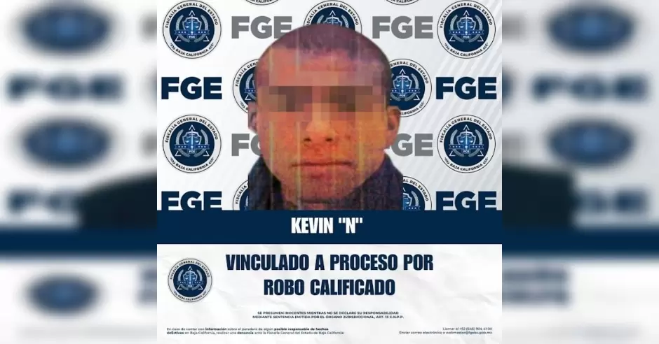 TIJUANA.- La Fiscalía General del Estado, a través de la Fiscalía Regional de Tijuana y la Unidad de Investigación de Robos Mariano Matamoros, logró que un juez de control vinculara a proceso a Kevin "N" por el delito de robo calificado cometido en establecimiento comercial abierto al público, ejecutado con violencia, en perjuicio de una cadena comercial Oxxo.