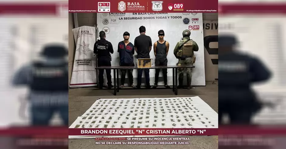 Ante estos indicios, se procedió a la detención de Brandon Ezequiel "N", de 18 años; Cristian Alberto "N", de 21 años; y un menor de 17 años, todos originarios de Mexicali, a quienes se les informaron sus derechos conforme a los protocolos establecidos.