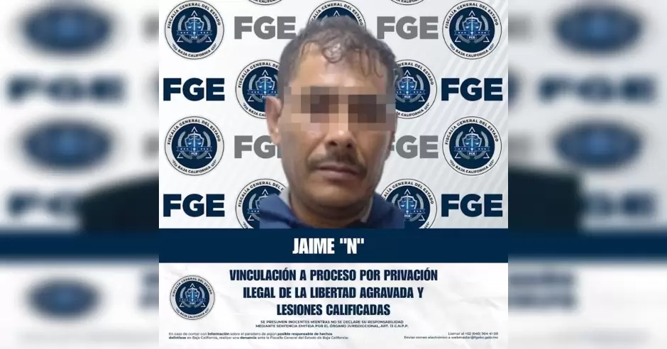 TIJUANA.- La Fiscalía Regional de Tijuana, a través de la Unidad de Investigación con Detenido, informa que obtuvo auto de vinculación a proceso y prisión preventiva oficiosa en contra de Jaime "N", por su presunta responsabilidad en los delitos de privación ilegal de la libertad agravada y lesiones calificadas.