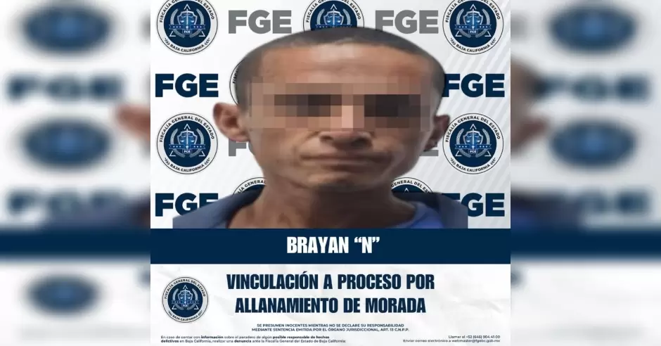 TIJUANA.- La Fiscalía Regional de Tijuana, a través de la Unidad de Investigación con Detenido, logró obtener auto de vinculación a proceso en contra de Brayan "N", por su presunta responsabilidad en el delito de allanamiento de morada. Lo anterior, derivado de un hecho ocurrido el pasado 29 de septiembre de 2025, aproximadamente a las 19:30 horas, cuando el imputado ingresó sin autorización al domicilio ubicado en la colonia Burócrata Ruiz Cortinez de esta ciudad.