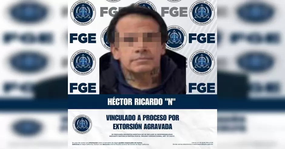 TECATE.- La Fiscalía General del Estado, a través de la Fiscalía Regional de Tecate y de la Unidad de Delitos Contra el Patrimonio, la Sociedad, el Estado y la Administración de Justicia, informó que se logró la vinculación a proceso y la imposición de la medida cautelar de prisión preventiva oficiosa en contra de Héctor Ricardo "N", por su presunta responsabilidad en el delito de extorsión agravada, cometido en el municipio de Tecate, Baja California.