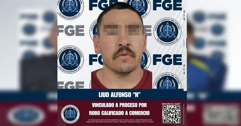 TECATE.- La Fiscalía Regional de Tecate, informa que se logró la vinculación a proceso en contra de Liud Alfonso "N", por su probable participación en el delito de robo calificado cometido a establecimiento comercial abierto al público.