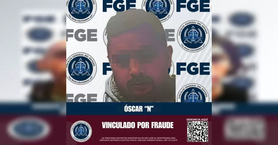 TECATE.- La Fiscalía Regional de Tecate, con las labores de investigación de la Unidad de Delitos Contra el Patrimonio, Sociedad, el Estado y la Administración de Justicia, logró la vinculación a proceso de Óscar "N", a quien se le señala de haber cometido fraude por la cantidad total de 570 mil pesos en moneda mexicana.