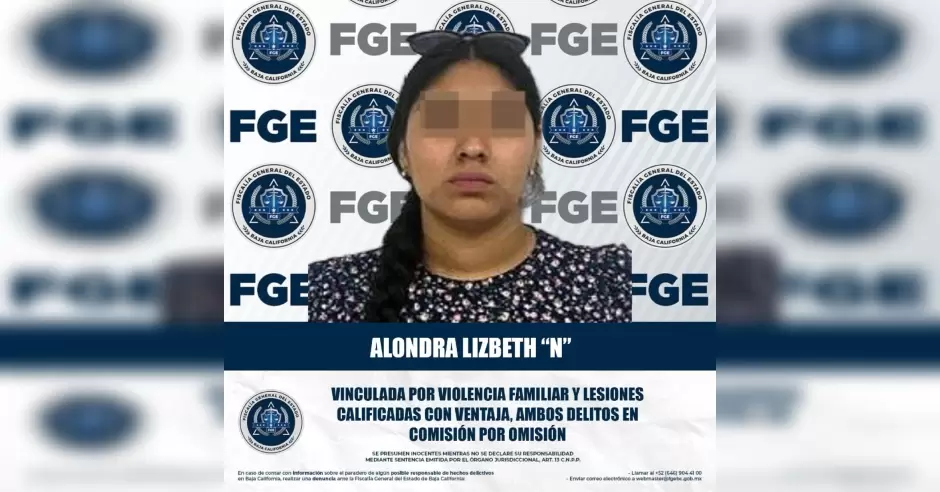TECATE.- La Fiscalía General del Estado (FGE), a través de la Fiscalía Especializada en Delitos contra Mujeres por Razón de Género, obtuvo la vinculación a proceso de Alondra Lizbeth "N", de 20 años, por los delitos de violencia familiar y lesiones calificadas con ventaja, ambos cometidos por omisión.