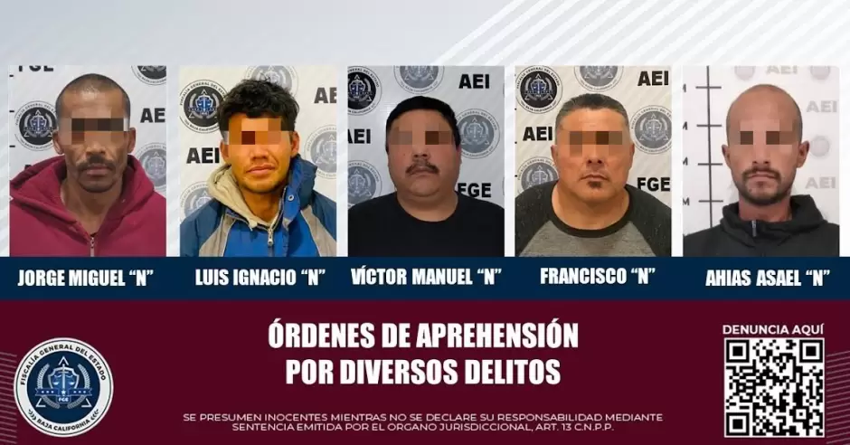 TIJUANA.- La Fiscalía General del Estado, por medio de sus agentes estatales de investigación de la Unidad de Aprehensiones, logró la detención de cinco imputados, en casos por separado, por los delitos de pederastia, robo con violencia, robo, violencia familiar y robo calificado.