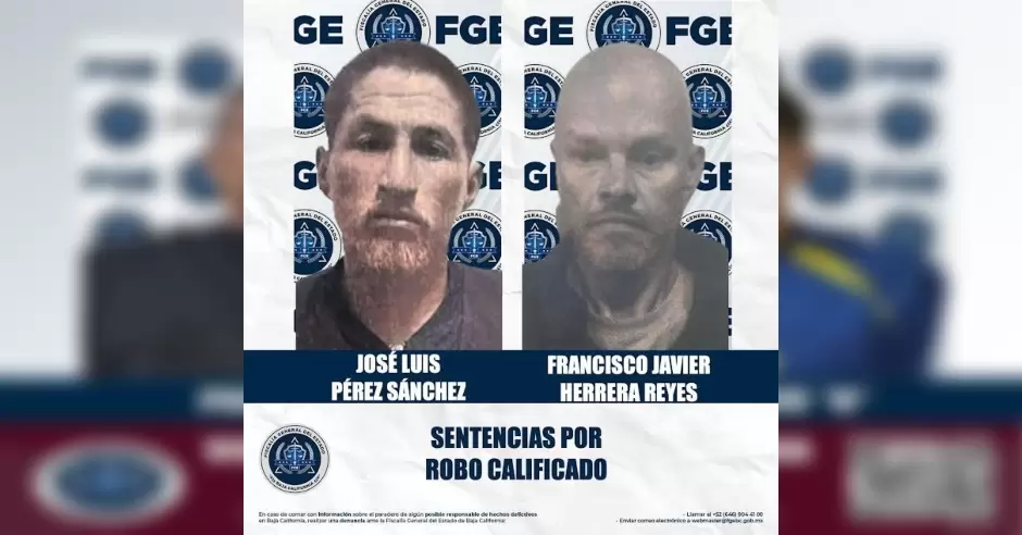 TIJUANA. - La Fiscalía General del Estado informa que se han dictado sentencias condenatorias contra dos individuos por el delito de robo calificado.