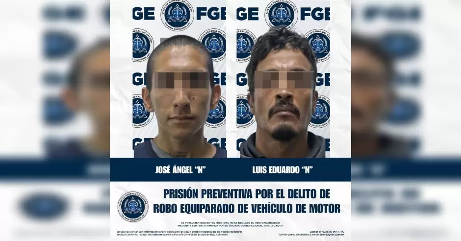 TIJUANA.- La Unidad de Investigación Especializada en Robo de Vehículos, adscrita a la Fiscalía Regional de Tijuana, obtuvo la medida cautelar de prisión preventiva justificada en contra de José Ángel "N" y Luis Eduardo "N", por el delito de robo equiparado de vehículo de motor, en su modalidad de usar y poseer.