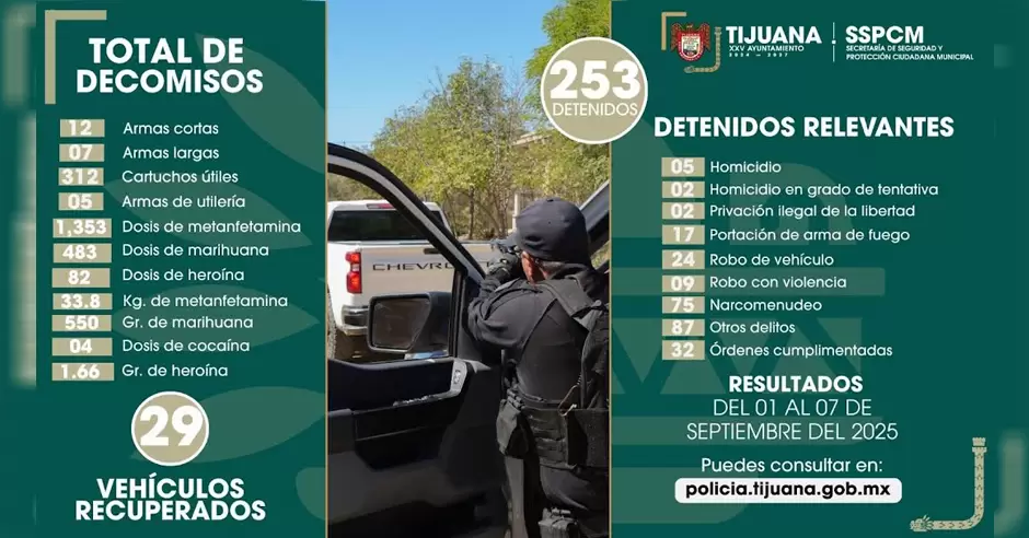 TIJUANA.- En un esfuerzo continuo por salvaguardar la seguridad y bienestar de la población, la Secretaría de Seguridad y Protección Ciudadana Municipal (SSPCM), ha reportado logros significativos en materia de prevención del delito durante la semana del 1 y el 7 de septiembre. En este periodo, fueron detenidas 253 personas señaladas como presuntas responsables de diversos delitos, así como el decomiso de 19 armas de fuego y múltiples sustancias prohibidas.