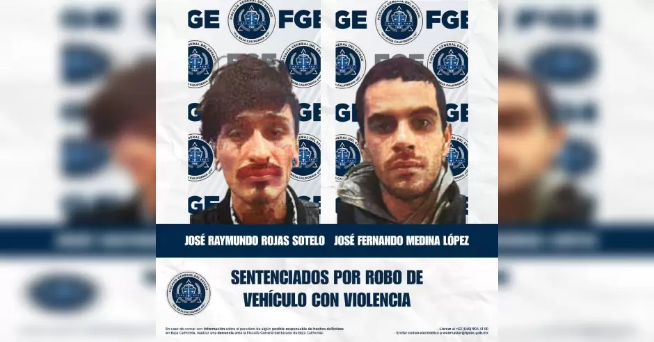 TIJUANA.- La Fiscalía Regional de Tijuana continúa fortaleciendo las acciones para combatir el delito de robo de vehículo en el municipio. Como resultado del trabajo constante de la Unidad de Investigación de Robo de Vehículo Zona Tijuana, se logró obtener sentencia condenatoria en contra de José Fernando Medina López y José Raymundo Rojas Sotelo, responsables del delito de robo de vehículo con violencia, cometido el pasado 14 de enero de 2025.