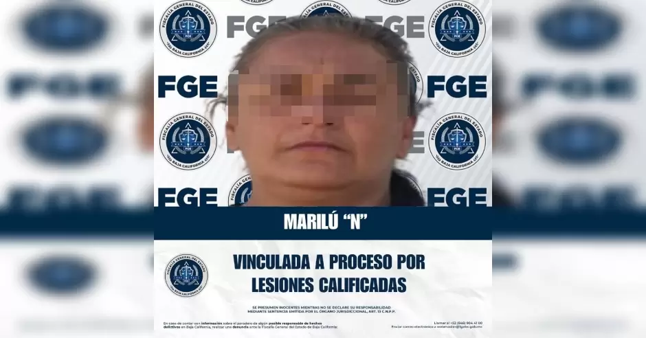 TIJUANA.- La Fiscalía General del Estado, a través de la Fiscalía Regional de Tijuana y del trabajo realizado por la Unidad de Investigación con Detenido, obtuvo auto de vinculación a proceso en contra de Marilú "N" por su probable responsabilidad en el delito de lesiones calificadas.