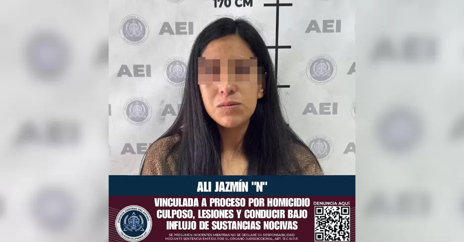 PLAYAS DE ROSARITO.- La Fiscalía Regional de Playas de Rosarito a través de la Coordinación de Unidad de Investigación de Detenidos logró obtener la vinculación a proceso de Ali Jazmín "N", por los delitos de homicidio culposo, lesiones por culpa, manejar vehículo en estado de ebriedad y bajo el influjo del psicotrópico marihuana y estupefaciente cocaína.