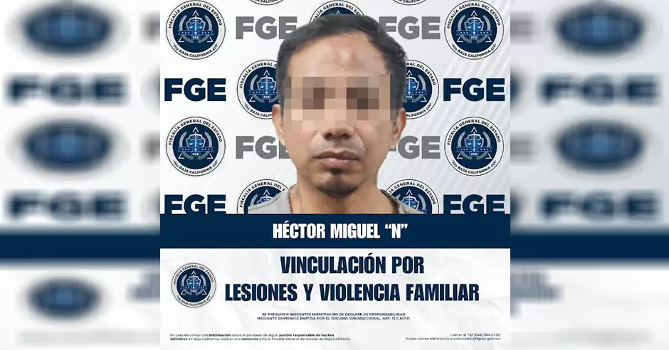TIJUANA.- La Fiscalía Regional de Tijuana, a través de las labores realizadas por la Unidad de Investigación con Detenido, logró la vinculación a proceso de Héctor Miguel "N" por su presunta responsabilidad en los delitos de lesiones y violencia familiar, derivado de hechos registrados en el fraccionamiento Hacienda Las Delicias III, en esta ciudad.
