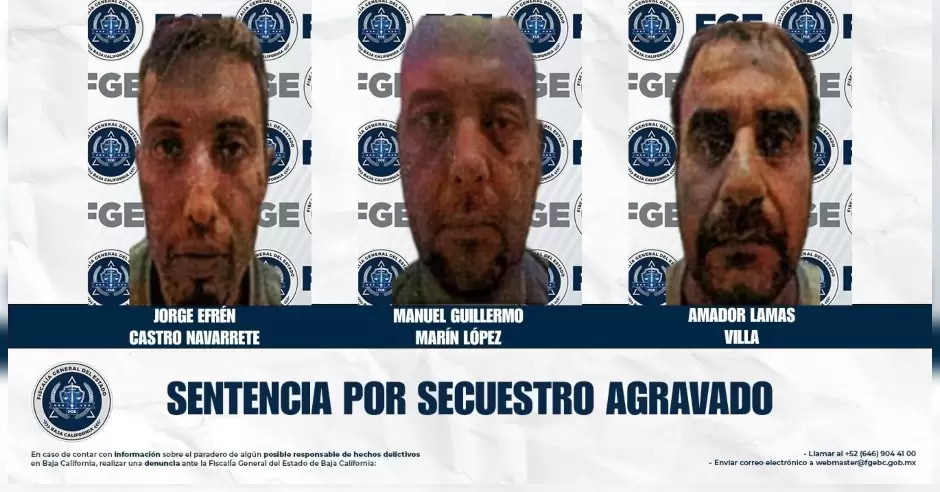 TIJUANA.- La Fiscalía General del Estado, a través de la Fiscalía Regional de Tijuana, obtuvo sentencia condenatoria contra tres hombres acusados del delito de secuestro agravado, imponiéndoles la pena de 60 años de prisión.