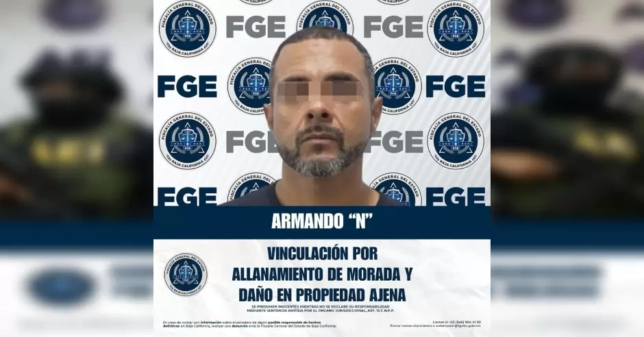 TIJUANA.- La Unidad de Investigación con Detenido, adscrita a la Fiscalía Regional de Tijuana, obtuvo la medida cautelar de prisión preventiva justificada en contra de Armando "N", por su presunta responsabilidad en los delitos de allanamiento de morada y daño en propiedad ajena.