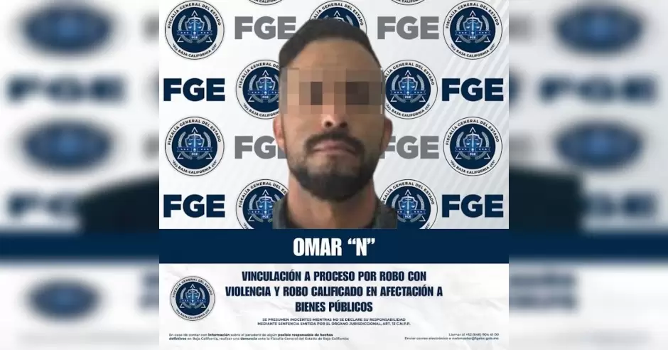 PLAYAS DE ROSARITO.- La Fiscalía General del Estado, a través de la Unidad de Investigación Especializada en Robos en Playas de Rosarito, obtuvo la vinculación a proceso de Omar "N", por su presunta responsabilidad en los delitos de robo con violencia y robo calificado cometido en contra de bienes afectados a la prestación de un servicio público municipal o estatal.