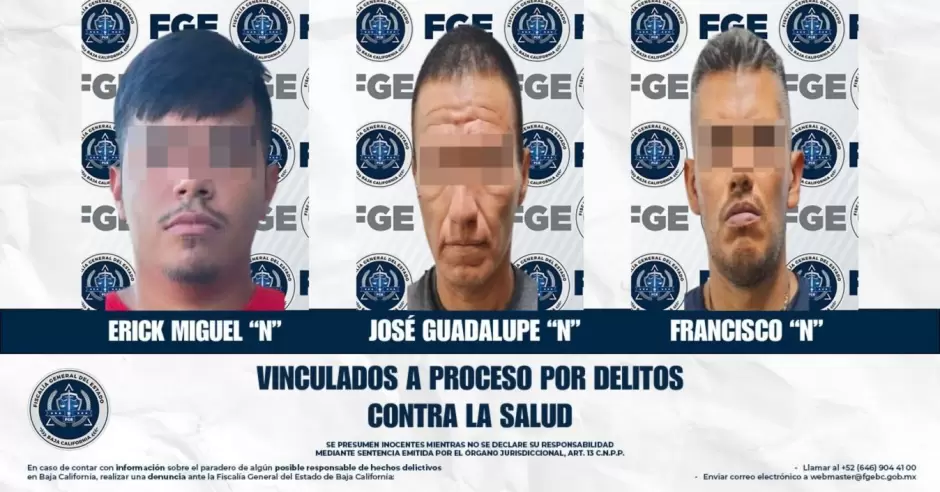 TIJUANA.- La Fiscalía Especializada en Narcomenudeo informa que, en audiencias por separado, se obtuvo la vinculación a proceso de tres personas por su probable responsabilidad en delitos contra la salud.