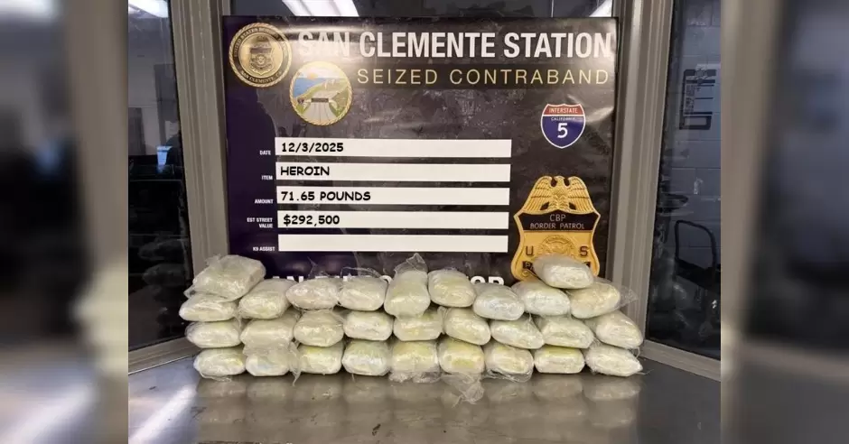 SAN DIEGO.— Agentes de la Patrulla Fronteriza del Sector de San Diego se asociaron con el Departamento del Sheriff del Condado de Orange para detener un importante intento de contrabando de narcóticos, interceptando más de 70 libras de heroína el miércoles por la noche.