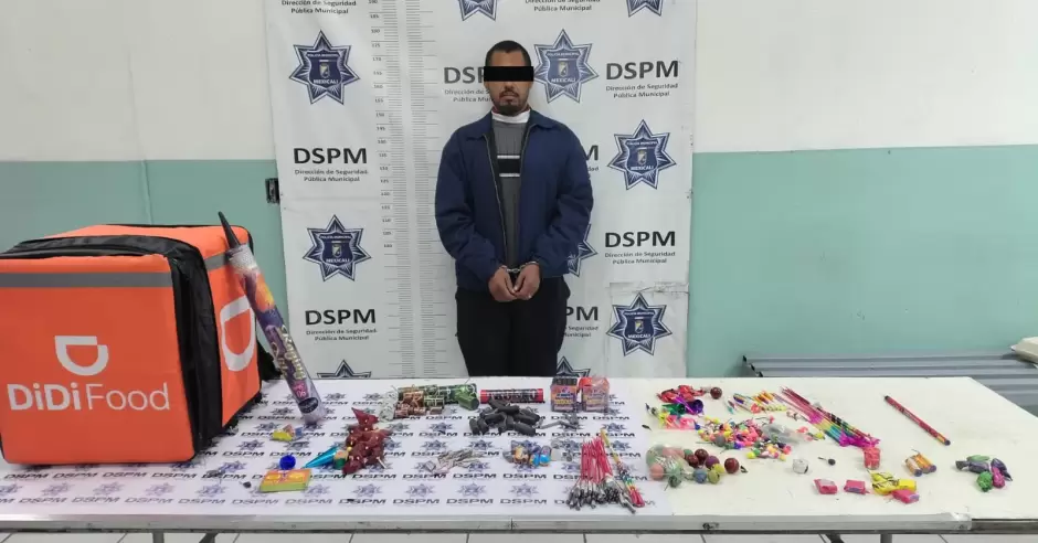 Mexicali.- Durante patrullajes de prevención y vigilancia del operativo "Diciembre Seguro", agentes de la Policía Municipal Mexicali detuvieron a un hombre que se encontraba en posesión de pirotecnia diversa, en el fraccionamiento Lagos del Sol.