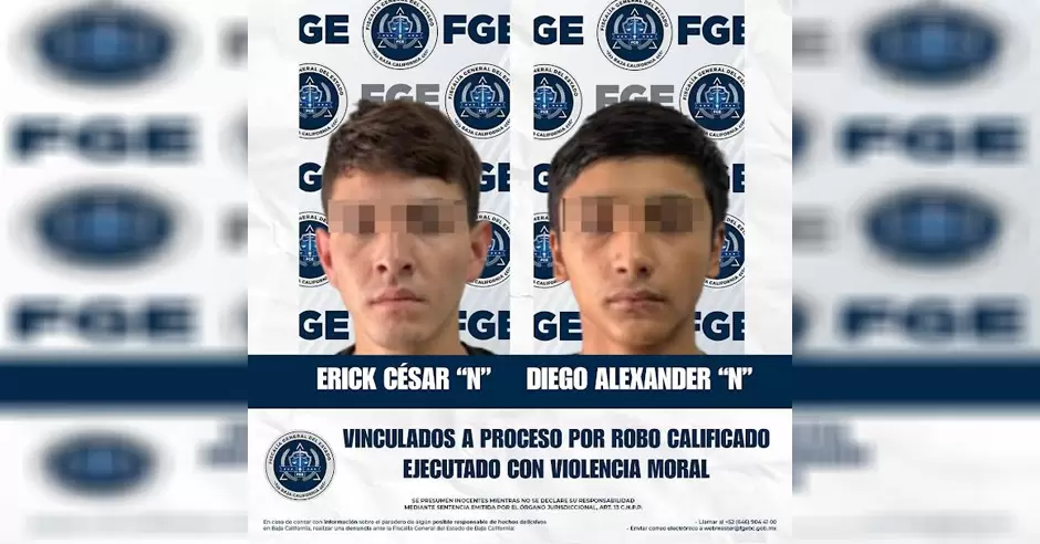 ROSARITO.- Con base a la presentación de pruebas sólidas, la Unidad de Investigación Especializada en Robos, adscrita a la Fiscalía Regional de Playas de Rosarito, en coordinación con Unidades Especializadas, logró la vinculación a proceso de Erick César "N" y Diego Alexander "N", por el delito de robo calificado cometido por dos o más personas ejecutado con violencia moral.