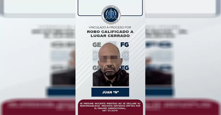 TIJUANA.- Los datos de prueba presentados por el agente del Ministerio Público de la Fiscalía Regional de Tijuana, fueron suficientes para que un Juez de Control vinculara a proceso a Juan "N", por el delito de robo calificado a lugar cerrado.