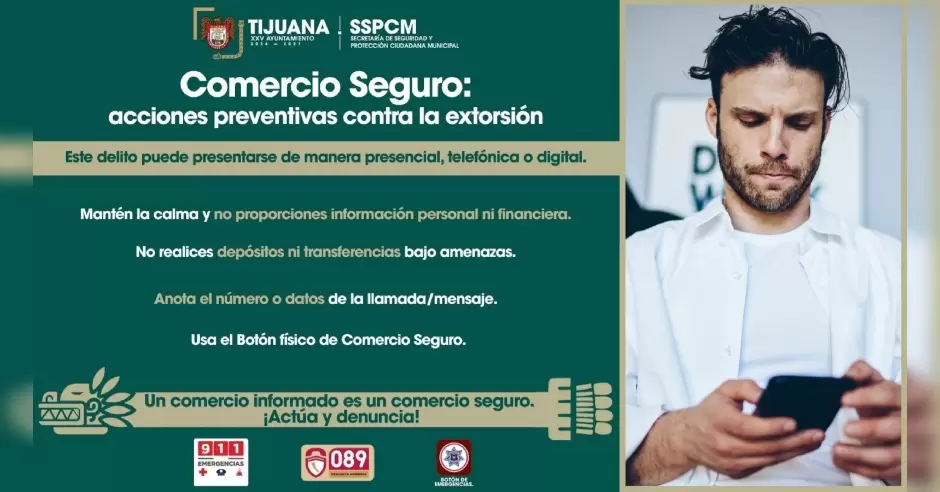 TIJUANA.- Con el propósito de salvaguardar a comerciantes y consumidores, la Secretaría de Seguridad y Protección Ciudadana Municipal (SSPCM) recomienda una serie de medidas preventivas para evitar ser víctimas del delito de extorsión y sobre la forma correcta de actuar en situaciones de riesgo.