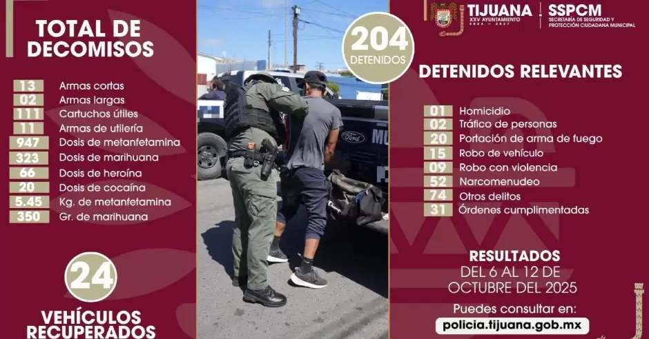 TIJUANA.- En un esfuerzo por privilegiar la paz y la tranquilidad en la ciudad, la Secretaría de Seguridad y Protección Ciudadana Municipal (SSPCM) ha implementado diversas acciones preventivas que han resultado en la detención de 204 personas presuntamente vinculadas a distintos delitos, durante el periodo comprendido entre el 6 y el 12 de octubre de 2025, donde además, se decomisaron armas de fuego y una cantidad significativa de sustancias prohibidas.