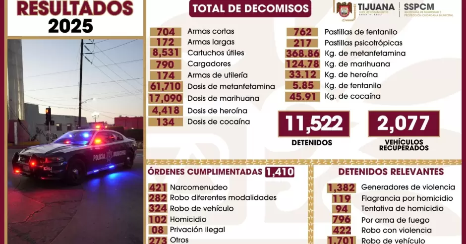 TIJUANA.- La Secretaría de Seguridad y Protección Ciudadana Municipal (SSPCM), logró durante el año 2025, avances significativos en sus esfuerzos por recuperar la paz y prevenir el delito en la ciudad.