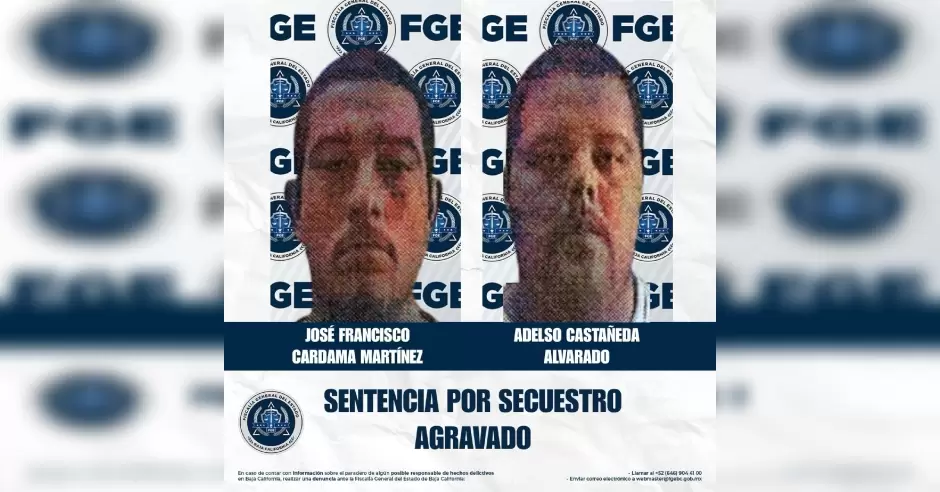 TIJUANA.- Como resultado del trabajo de investigación, la Fiscalía Regional de Tijuana logró que el juez dictara una sentencia de 23 años de prisión en contra de José Francisco Cardama Martínez y Adelso Castañeda Alvarado, al acreditarse su responsabilidad en un secuestro agravado cometido contra un menor de 17 años de edad.