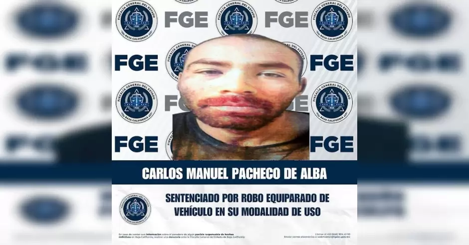 TIJUANA.- La Unidad de Investigación de Robo de Vehículos, adscrita a la Fiscalía Regional de Tijuana, obtuvo sentencia condenatoria en contra de Carlos Manuel Pacheco de Alba, por el delito de robo equiparado de vehículo de motor en su modalidad de uso.