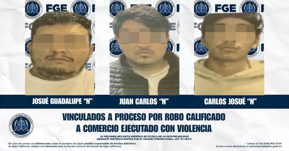 TIJUANA.- La Fiscalía Regional de Tijuana obtuvo la vinculación a proceso y la medida cautelar de prisión preventiva contra Josué Guadalupe "N", Juan Carlos "N" y Carlos Josué "N", señalados por su presunta participación en el delito de robo calificado a comercio abierto al público con violencia.