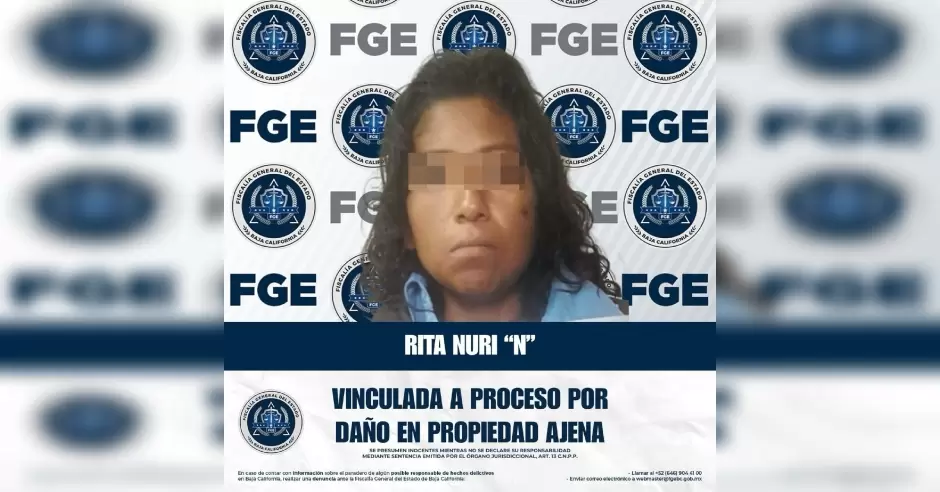 TIJUANA.- La Fiscalía Regional de Tijuana, a través de la Unidad de Investigación con Detenido, logró la vinculación a proceso y la medida cautelar de prisión preventiva justificada en contra de Rita Nuri "N" por el delito de daño en propiedad ajena, tras haber sido detenida en flagrancia por la Policía Municipal.