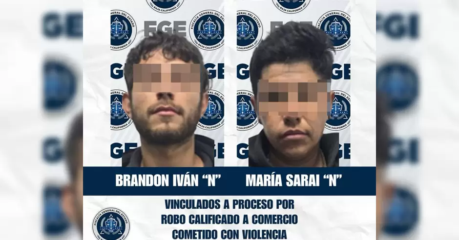 TIJUANA.- La Fiscalía Regional de Tijuana, a través de la Unidad de Investigación con Detenido, obtuvo la vinculación a proceso y la imposición de prisión preventiva oficiosa en contra de Brandon Iván "N" y María Sarai "N", por su presunta responsabilidad en el delito de robo calificado a comercio abierto al público, ejecutado con violencia.