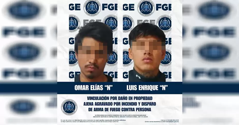 TECATE.- La Fiscalía Regional de Tecate, a través de la Unidad de Investigación de Delitos con Detenido, informa que fueron vinculados a proceso los imputados Omar Elías "N" y Luis Enrique "N", por su presunta responsabilidad en los delitos de daño en propiedad ajena agravado por incendio y disparo de arma de fuego contra persona.