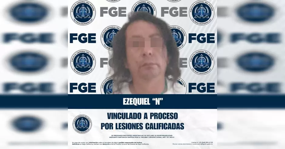 TIJUANA.- La Unidad de Investigación con Detenido, adscrita a la Fiscalía Regional de Tijuana, obtuvo la vinculación a proceso y la medida cautelar de prisión preventiva justificada en contra de Ezequiel "N" por el delito de lesiones calificadas.