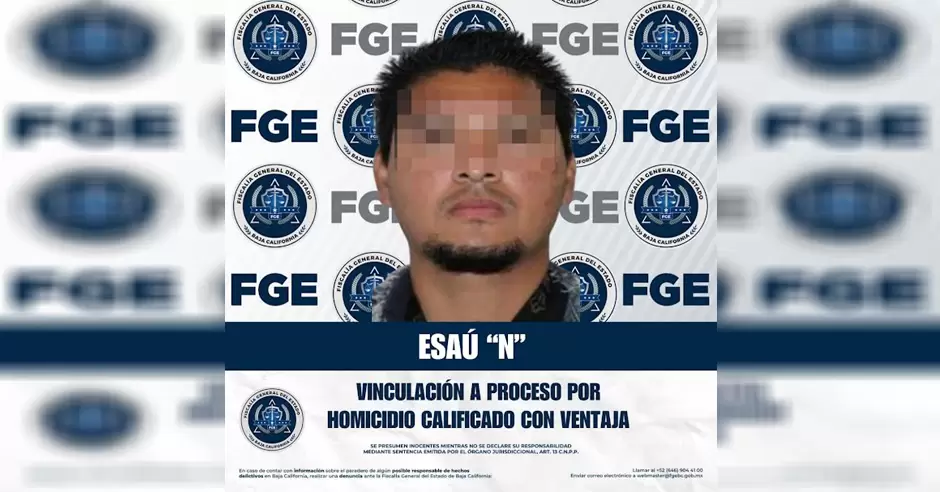 TIJUANA.- La Fiscalía General del Estado de Baja California, a través de la Fiscalía Especializada en Delitos Contra la Vida, obtuvo la vinculación a proceso de Esaú "N" por su presunta responsabilidad en el delito de homicidio calificado con ventaja.