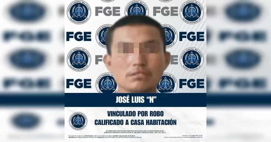TIJUANA.- La Fiscalía Regional de Tijuana, a través de la Unidad de Investigación con Detenido, obtuvo la vinculación a proceso y la medida cautelar de prisión preventiva oficiosa en contra de José Luis "N", por el delito de robo calificado a casa habitación.