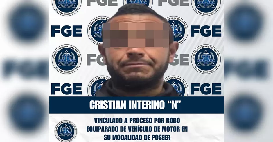 TIJUANA.- La Fiscalía Regional de Tijuana, a través de la Unidad de Investigación de Robo de Vehículos Zona Tijuana, obtuvo la vinculación a proceso de Cristian Interino "N", por su presunta responsabilidad en el delito de robo equiparado de vehículo de motor en su modalidad de poseer.