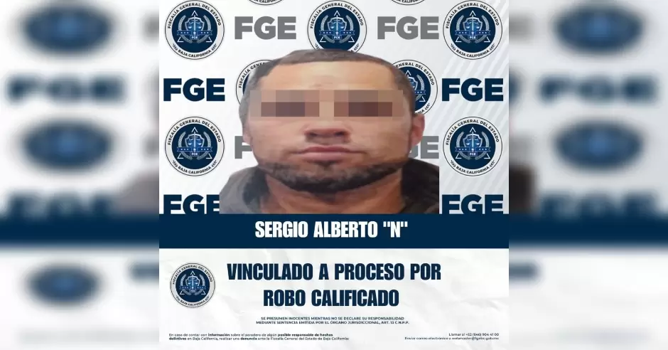 TIJUANA.- La Fiscalía Regional de Tijuana obtuvo la vinculación a proceso en contra de Sergio Alberto "N", por el delito de robo calificado cometido en un establecimiento comercial abierto al público y ejecutado con violencia.