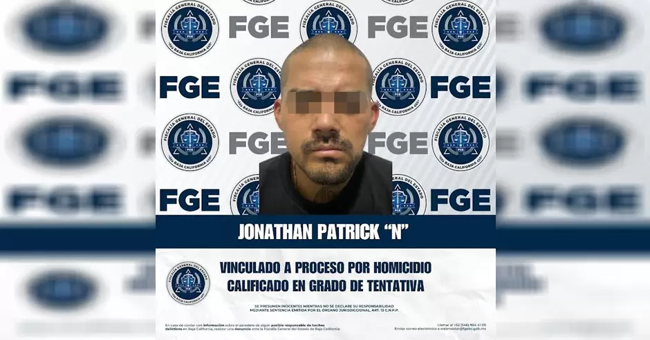 TIJUANA.- La Fiscalía General del Estado, a través de la Fiscalía Especializada en Delitos Contra la Vida, obtuvo la vinculación a proceso y la imposición de la medida cautelar de prisión preventiva oficiosa en contra de Jonathan Patrick "N", por su presunta responsabilidad en el delito de homicidio calificado en grado de tentativa.