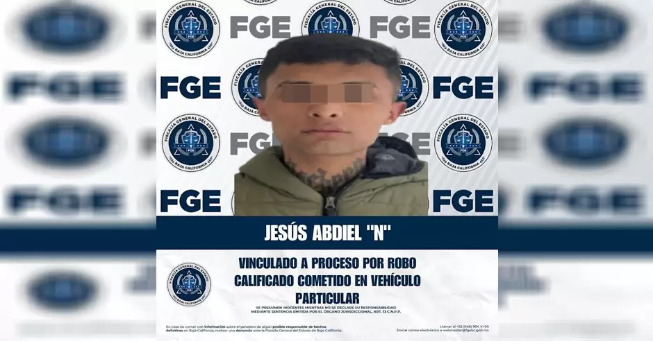 TIJUANA- La Fiscalía Regional de Tijuana obtuvo la vinculación a proceso en contra de Jesús Abdiel "N", por su presunta responsabilidad en el delito de robo calificado cometido en vehículo particular, ejecutado con violencia.