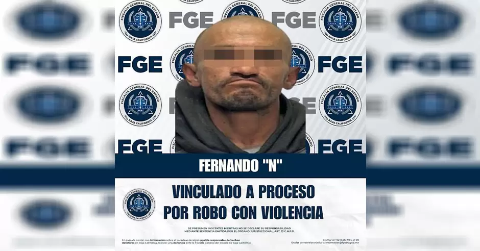 TIJUANA.- La Unidad de Investigación con Detenidos, adscrita a la Fiscalía Regional de Tijuana, obtuvo la vinculación a proceso y la medida de prisión preventiva justificada en contra de Fernando "N" por el delito de robo con violencia.