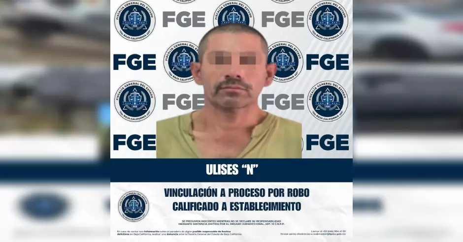 TECATE.- La Unidad de Delitos Contra Robos, adscrita a la Fiscalía Regional de Tecate, obtuvo la vinculación a proceso en contra de Ulises "N", por su presunta responsabilidad en el delito de robo calificado cometido a establecimiento abierto al público.