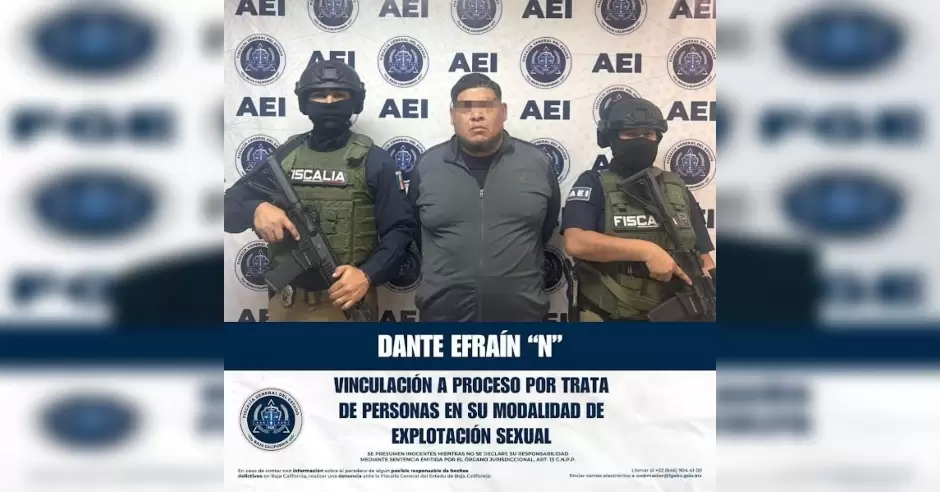 TIJUANA.- La Fiscalía General del Estado, a través de la Unidad de Investigación Especializada en el Combate a la Trata de Personas, adscrita a la Fiscalía Especializada en Delitos Contra Mujeres por Razón de Género, obtuvo la vinculación a proceso y la imposición de la medida cautelar de prisión preventiva en contra de Dante Efraín "N", señalado por su probable responsabilidad en el delito de trata de personas en su modalidad de explotación sexual.