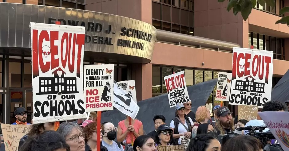 SAN DIEGO.- Un grito de resistencia retumbó frente al edificio federal Edward J. Schwartz en el corazón de San Diego. Con pancartas en mano y una indignación creciente, cientos de ciudadanos se congregaron para denunciar lo que consideran una cacería humana por parte de ICE, la cual, aseguran, ha cruzado una línea roja: la seguridad de los entornos escolares.