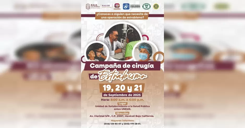 BAJA CALIFORNIA.- Para la gobernadora Marina del Pilar Ávila Olmeda cuidar la salud de las familias bajacalifornianas es una de los principales objetivos en los que se trabaja de manera ardua y responsable, en especial de las niñas y niños, garantizando que aquellos grupos prioritarios tengan acceso a los programas que les permitan tener una mejor calidad de vida, por lo que del 19 al 21 de septiembre se realizará la ya tradicional campaña de Cirugía de Estrabismo en Mexicali.