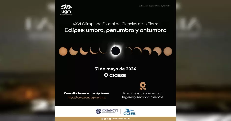 ENSENADA.- Con la temática "Eclipse: umbra, penumbra y antumbra", el CICESE y la Unión Geofísica Mexicana invitan a estudiantes de preparatoria de Baja California a participar en la XXVI Olimpiada Estatal de Ciencias de la Tierra el próximo viernes 31 de mayo.